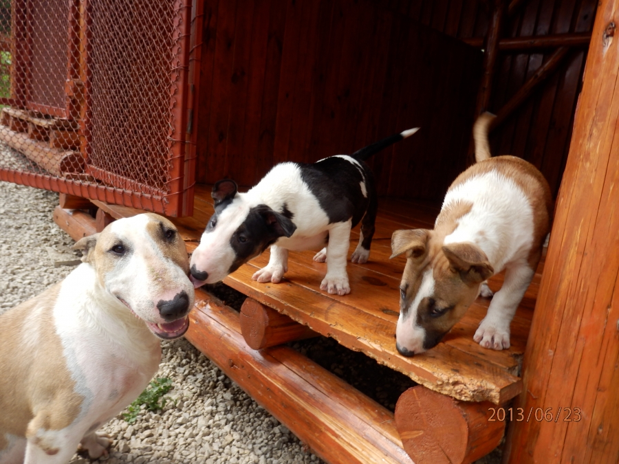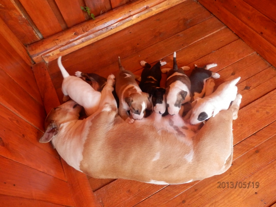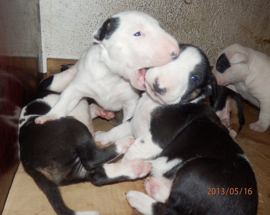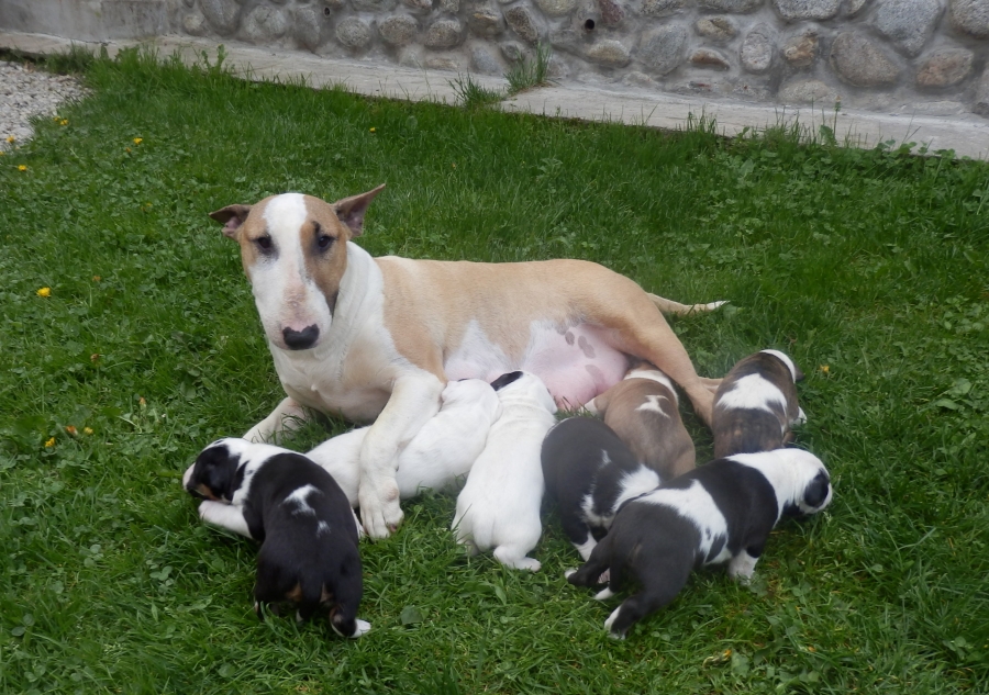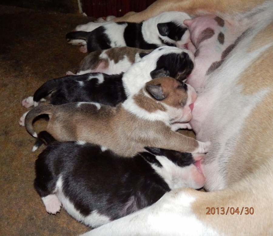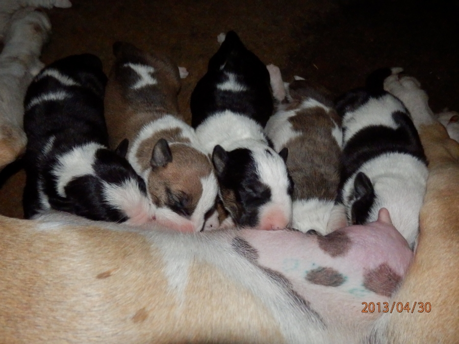 otec: ALL RIGHT Bull of Diamond (biely); (stará matka: biela, pásikavé zn., starý otec: biely, čierne zn.)