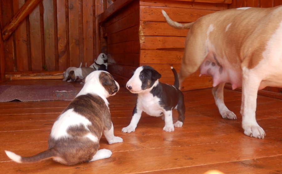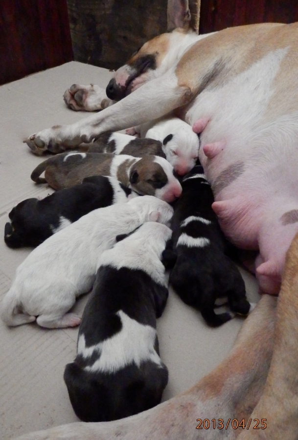 otec: ALL RIGHT Bull of Diamond (biely); (stará matka: biela, pásikavé zn., starý otec: biely, čierne zn.)
